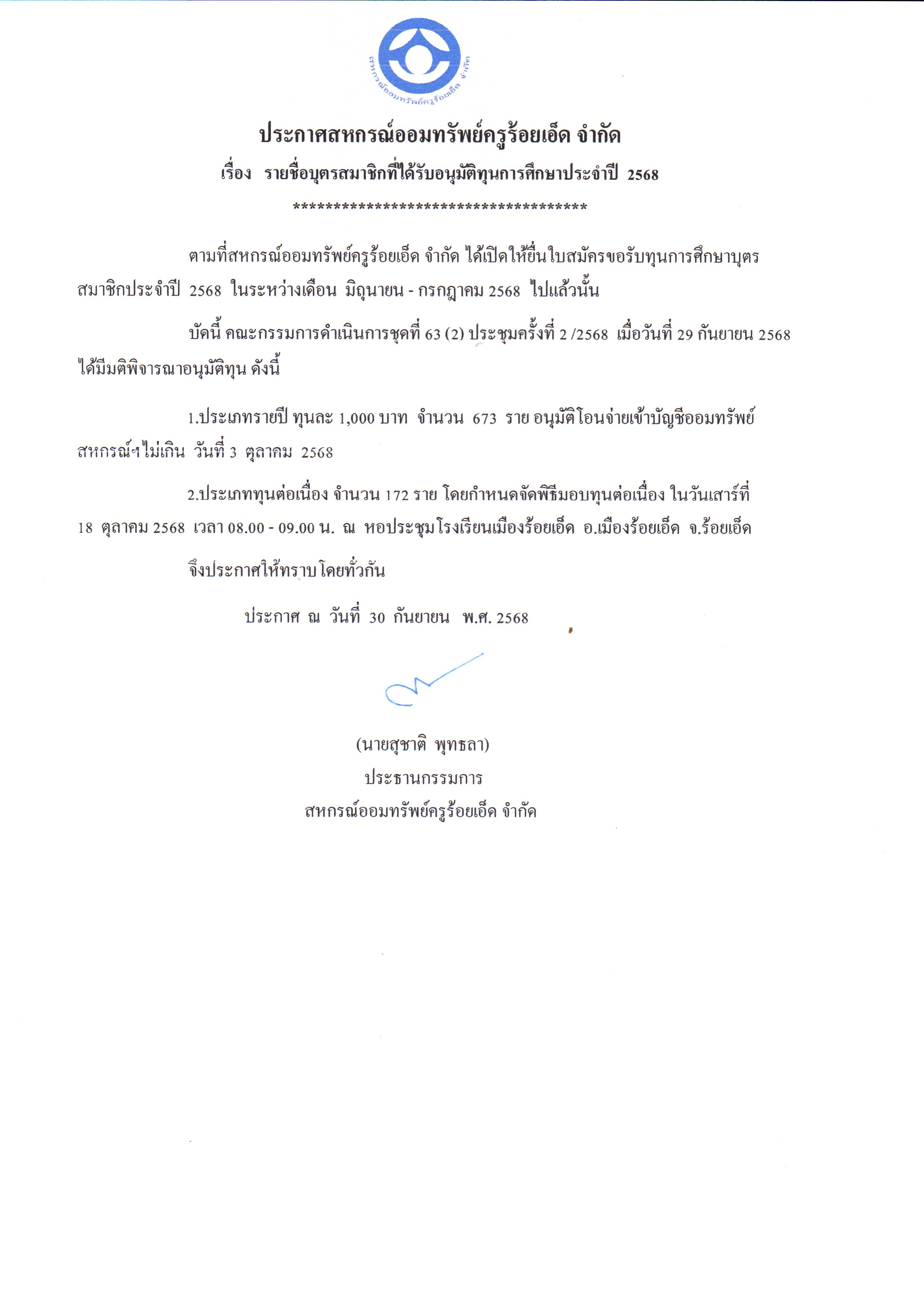 รายชื่อผู้ที่ได้รับการอนุมัติทุนการศึกษารายปี 2568